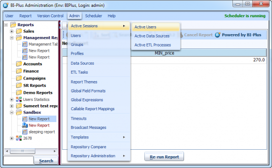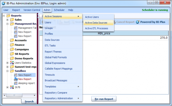 Active Datasources work pretty much the same as Active Users does. When a report is run against any data-source then the data-source status becomes active. The Active Datasources dialog can be accessed from Admin ⇒ Active Session menu.