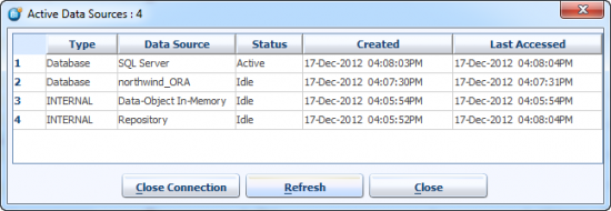 This opens the Active Datasources dialog, which is used to view information about active data sources. It shows the type of datasource, its name and status of that data-source(Active, Idle). You can also view when the data source connection was created and when it was last accessed.