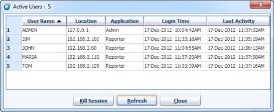 BIPLUS lets Administrators check who is logged in at any time, which application they are logged into (Reporter, Admin, OpenReport, StaticReport), where they are logged in from (IP Address), their login time and also the ability to terminate the session if needed. Click on Active User option in Admin ⇒ Active Sessions menu. See image below.