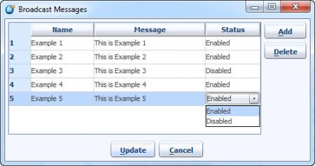 When the Broadcast Message dialog opens, you will see all the Broadcast messages defined for the system. Only those Broadcast messages marked as ‘Enabled’ will be broadcast to ALL users of the system.