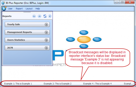 When you login into the Reporter interface, all broadcast messages will be displayed in the browser Status Bar (situated at the bottom of window). The message set will be displayed as a scrolling marquee type. See image below.