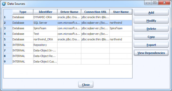 The Data Source dialog allows you to Add, Modify, Delete, Copy, Export and View Dependencies of each datasource.