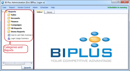 When you open BI PLUS, you will see that the reports are organized into categories or reports. In following image, Reports category is root of the tree hierarchy. You will see the categories as the highest level, kind of like sub-directories in a Windows File Explorer.