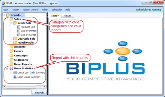 Categories: The categories in the above BIPLUS system are Sales, Accounts, Finance, Campaigns, SR Reports and Demo Reports. Categories are always displayed with a yellow folder icon. Categories in BIPLUS can have multiple categories and reports under them as their child category or child report.