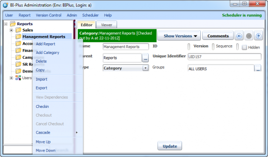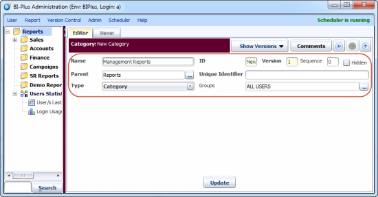 Once you are done with the above, click on the Update button to save the category information and the category will be created in the Reports Tree under the Reports node. This way you can create multiple categories under any category.