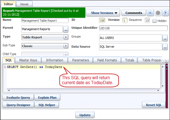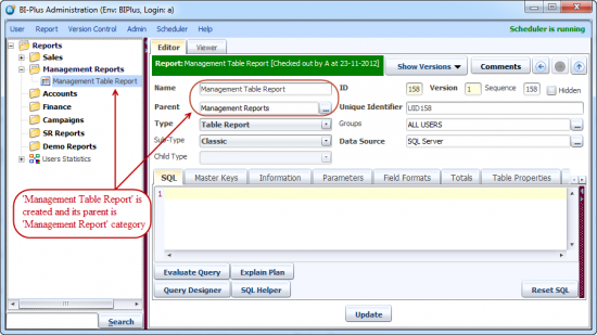 When you click on the Update button, the 'Management Table Report' will be saved in 'Management Report' category in the repository. BI Plus automatically checks the report out to the current developer. The Unique Identifier provides a UID to newly created report.