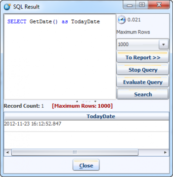 When you click on the Evaluate Query button, it will execute the SQL statement against the database, displaying the results in a 2 dimensional grid.