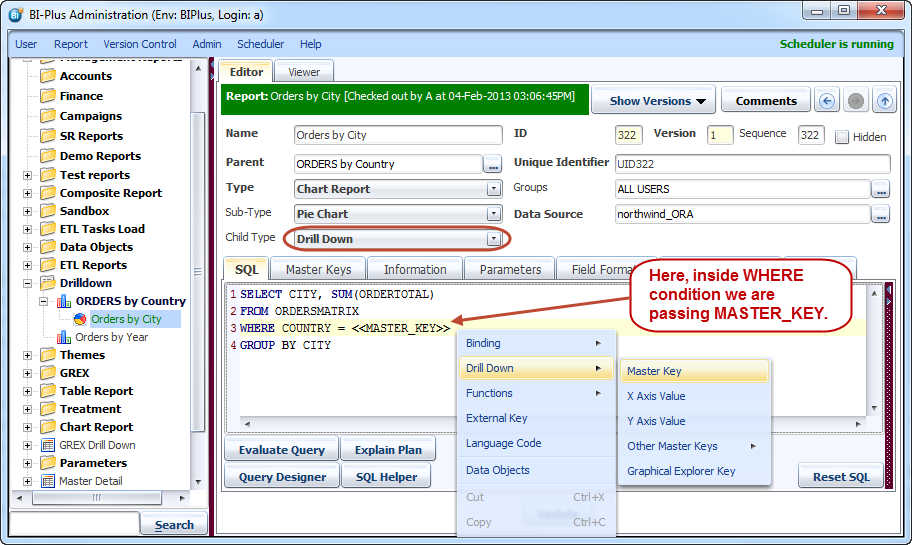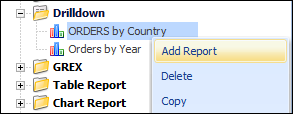 Now we are ready to create the child report to drill down to, that references the value of the passed down key. First, in the left tree, we right-click the existing report (ORDERS by Country) and select the Add Report option to add a child report under ORDERS by Country report.