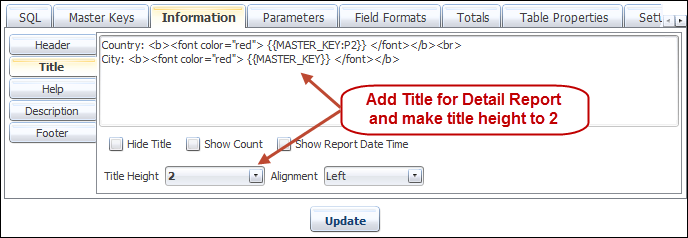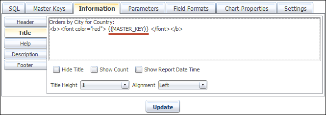First we find the column that is to be used as the drop-down key. In our query, it is referenced as Country. Navigate the Master Keys tab, add a key and then from the 'Column Name' Dropdown list, select the column, which is parsed from the query statement. And then assign a MASTER_KEY. BIPLUS allows up to 10 keys per report.