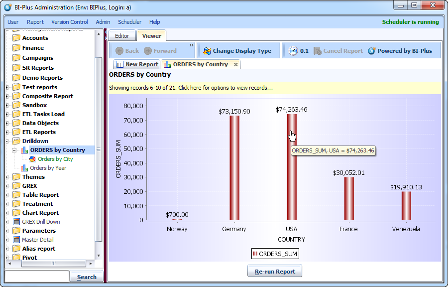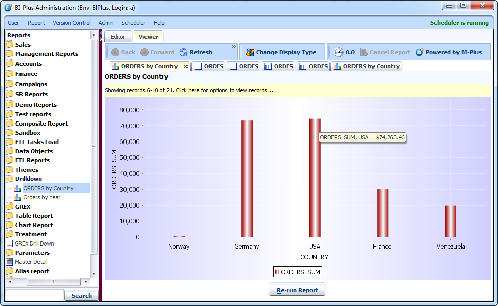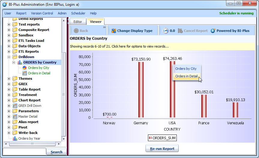 Now run the parent report ORDERS by Country. Notice that the pointer turns to a hand when there is a suitable drilldown report child. click on one of the bars, here we have clicked ob USA.
