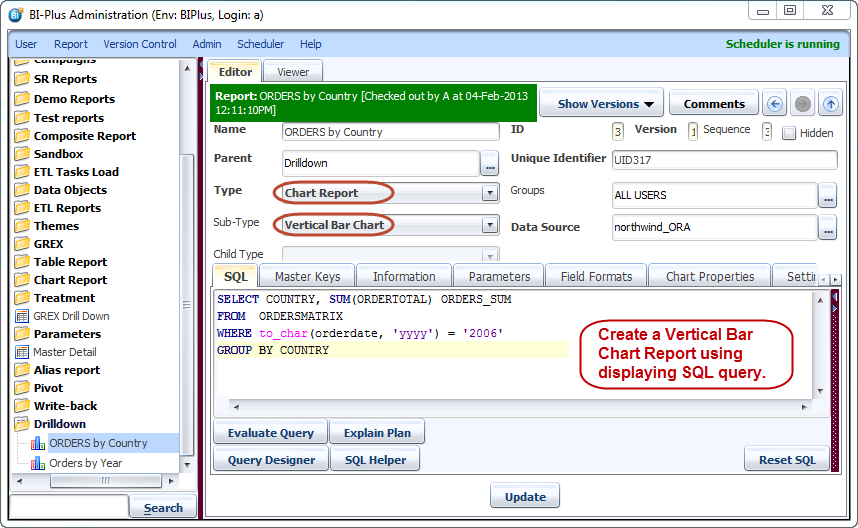 First you need to create a Chart report which is displaying Orders by COUNTRY. Give name to the report as ORDERS by Country and write SQL for it as shown below.