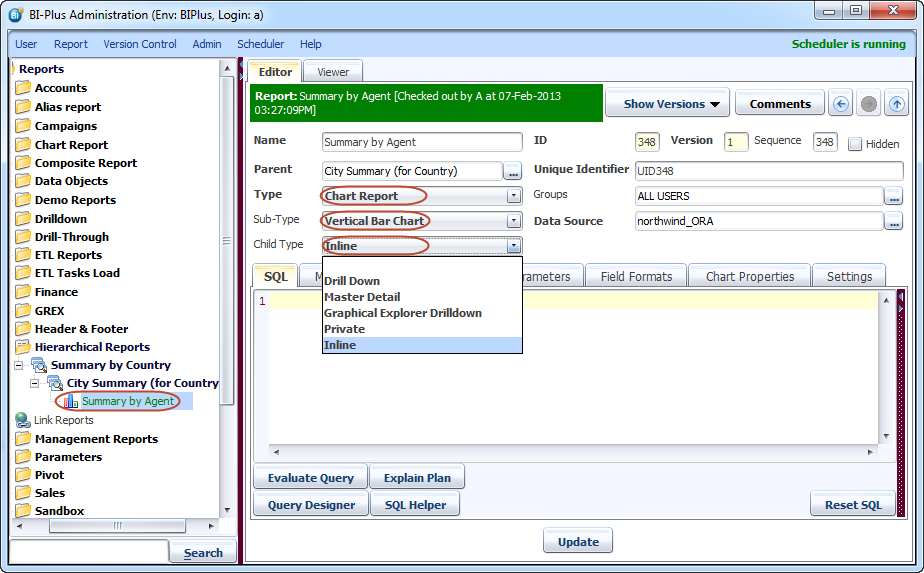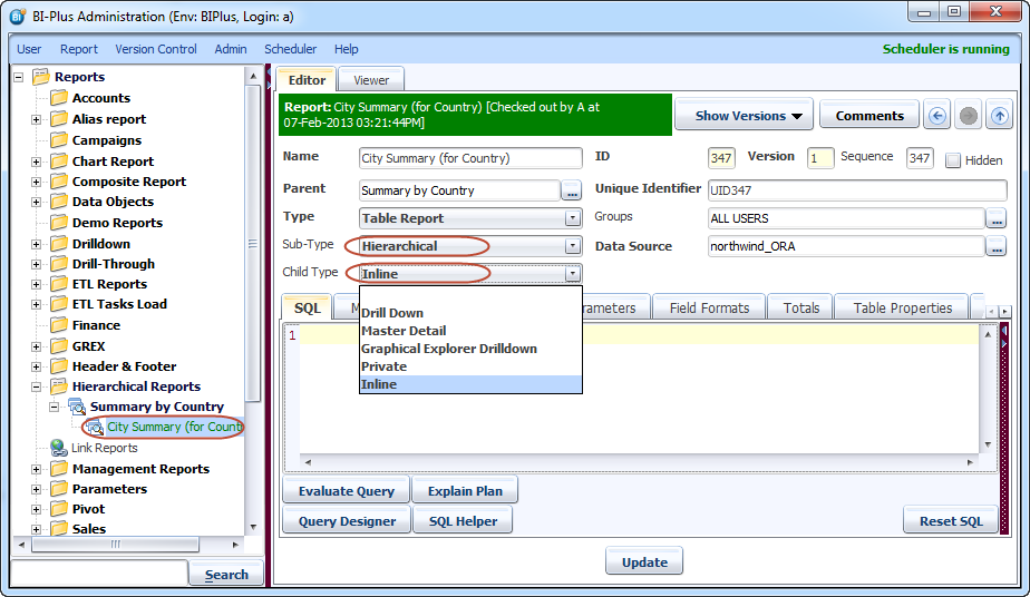 Now right click on Summary by Country report and add a report under it. Give it a name like we have given here City Summary. Remember if the parent is hierarchical then only child can be Inline report. Select 'Sub-type' of this report as Hierarchical and 'Child-Type' as Inline report. We are selecting 'Sub-Type' as Hierarchical because child of current report can also be an inline report.