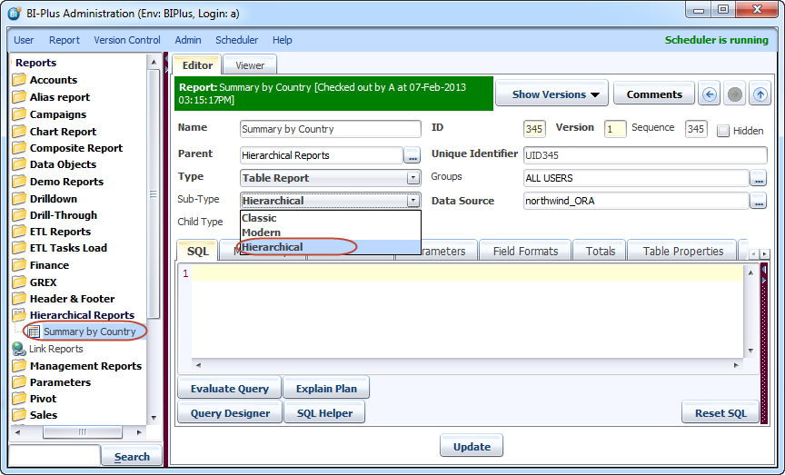 Let's create first report Summary by Country. Add a report in Reports Tree and of 'Type' Table report and 'Sub-Type' as Hierarchical.
