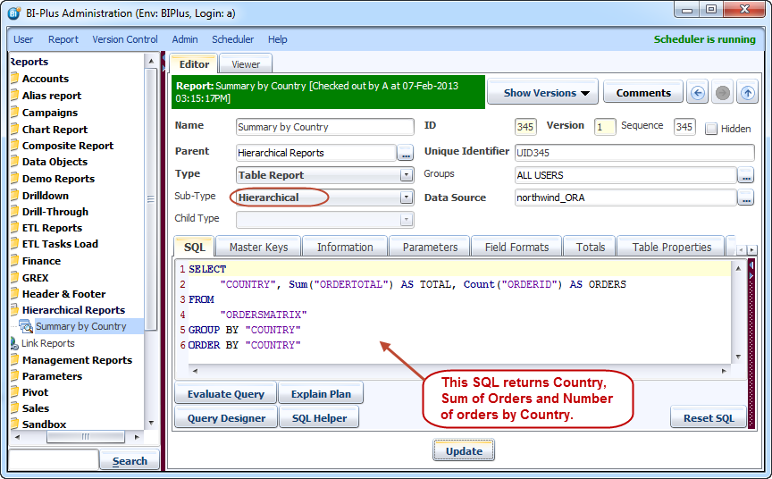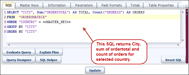 For parent report write following SQL into SQL editor tab for the Northwind data source. Add COUNTRY as MASTER_KEY from Master Keys tab.