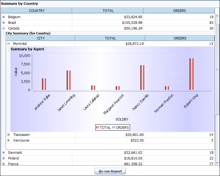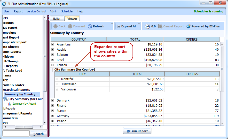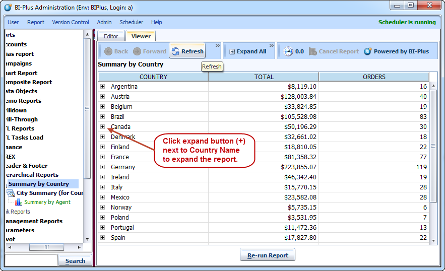 Now run the parent report Summary for Country. On report run you will notice that next to each record there is '+' sign, indicating that you can expand it further.