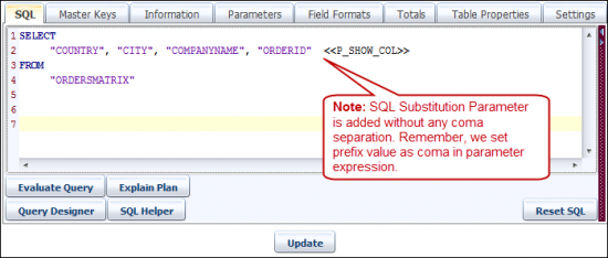 The example shows that the first SQL parameter substitutes the «SQL_SUB_PARA» and displays columns according to selection. «SQL_SUB_PARA_2» replaces SALESMAN.