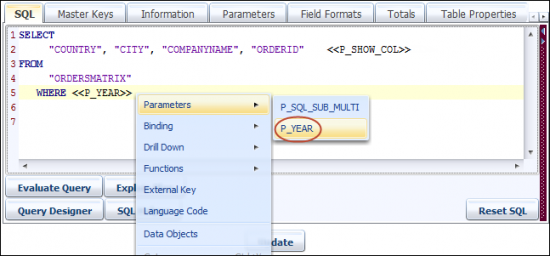 Now add the WHERE clause in the SQL query. Using the right click menu add the parameter «P_YEAR». SQL statements of selected parameter values will be replaced with the «P_YEAR» parameter.