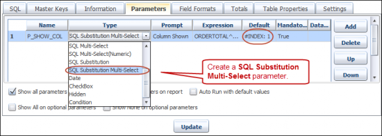 SQL Substitution Multi-Select allows you to substitute one or more piece of SQL statements in the query, depending on the parameter selected. This type of parameter is mostly used when you want to show/hide columns dynamically. On the report run SQL Substitution displays a dialog box so that the user can select multiple parameter values. After selection of values, respective SQL is substituted in the SQL query. You can also use this in a conditional statement like a WHERE clause. Let's see how to use the SQL Substitution Multi-Select.