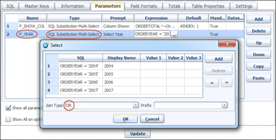 Now let's add a condition in the SQL query. The condition will display the Orders by Year. For this create a another SQL Substitution Multi-Select Parameter. Give it a name (P_YEAR). Select parameter Type as SQL Substitution Multi-Select.