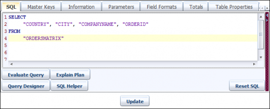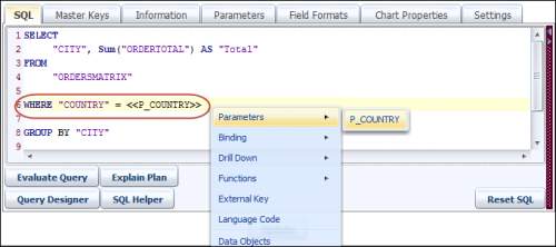 Now add these parameters in the WHERE clause of the SQL query to filter the date range using the parameter values at runtime. Use the right-click option in the SQL query editor to invoke the dialog as shown below.