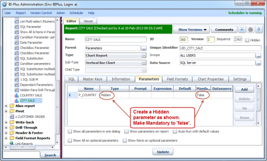 Now go back into the SQL tab of CITY SALE report. Add a WHERE clause to filter the record by COUNTRY. Add the create parameter in it.