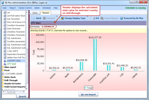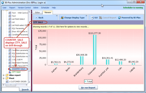 When you double click on a bar. BIPLUS performs the drill-through action and opens the CITY SALE report. CITY SALE report shows sale by city for selected country.