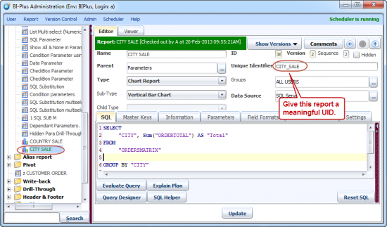 Now create a another Vertical Bar Chart report. Give the report a name(CITY SALE). Write down SQL for the report as shown below. Here we have given a meaningful name to Unique Identifier. This UID name will tell the parent report that in which report to drill-through.