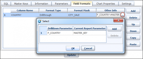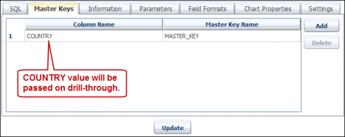 Now create COUNTRY as a MASTER_KEY. As this is going to be drill-through report, we will pass COUNTRY value to child report on the drill-thorugh to view the details of Sale by city.