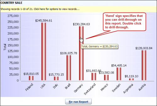 Now run the COUNTRY SALE report. Move mouse cursor on any vertical bar of the chart report. This will change the mouse cursor to Hand icon. Using hand icon double click on a bar.