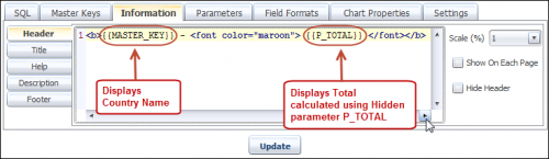 Now you can use this parameter in Title/Header/Footer of your report. Just enter parameter name inside curly braces. Image shows that we have entered Title using some HTML code. You can use HTML code to set font, color etc. Here we have given maroon as color and BOLD as style.
