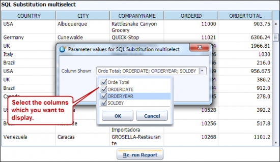 Now run the report. You will get the prompt for parameter selection. Select the columns which you want to add in the report. The first parameter value will be always selected because we had set this in Defaults (#INDEX:1). When finished with the value selection, click on the OK button.