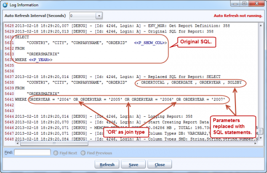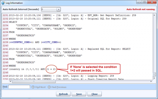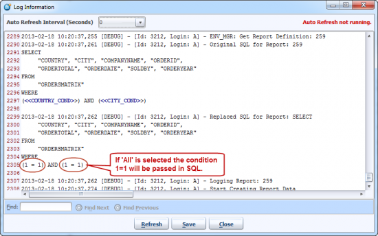 Log Information dialog will get opened. In log Parameter Values for report will show you parameters selected (P_COUNTRY=France,Germany). The log also shows replaced SQL for the report.