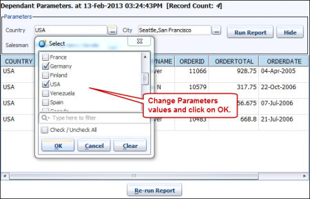 The third parameter SALESMAN is dependent on CITY. This parameter returns all distinct records for the SALESMAN (SOLDBY) which are in the CITY parameter. The CITY parameter retrieves all records which are part of the countries chosen in the COUNTRY parameter. Also enable the Show all parameters on the dialog option from the parameter tab.