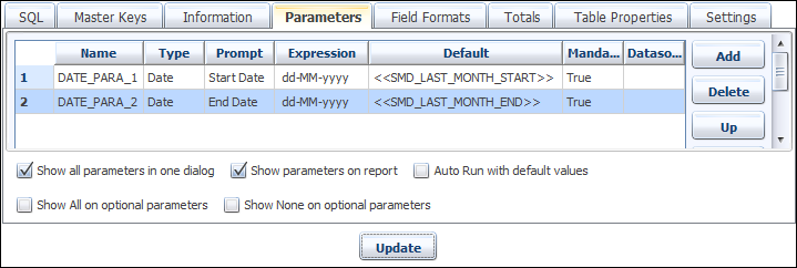 In the previous example, the report was parameterized and in effect could be the sales for ANY date range. To truly give us a feeling of last month’s sales, it would be good to have the parameter values defaulting to the 1st and last day of the previous month. This saves several key strokes and user interaction at runtime, especially if it is known that for the most part, the end user wants to run the report based on “last month's” data.