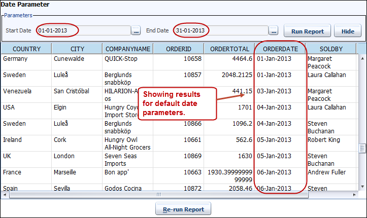 The report will display columns and orders for the year according to the parameters selected. Here we have dynamically added the columns (ORDERTOTAL, ORDERDATE, ORDERYEAR, SOLDBY) and also getting the records for orders for selected years (2004, 2005, 2006, 2007).