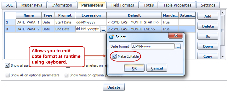 Sometimes the level of granularity for a date parameter needs to be to hours, minutes or even seconds. Since the date parameter is passed to the query as a prepared statement / bind variable, BI Plus uses the accepted date-time format for each individual datasource type, each of which support to the level of seconds or even to milliseconds in some instances (dependent on data type). Enable Make Editable option from Expression section of parameters.