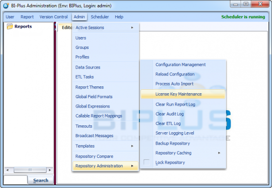 You may have already obtained a BI PLUS license key. Make sure that the license key you have is valid. License keys are unique to a particular repository database. BI PLUS will run for 7 days after installation without a license key. BI PLUS has 5 days of grace period after expiration of license key. Once this grace period expires, the entire application effectively shuts down and the only type of user allowed into the system is an Administrator user and the only function this Administrator can do in this mode is to update / enter the license key. Until a valid license key is entered, the entire environment is locked and not available to Reporter, Developers, Power Users or External Users.
