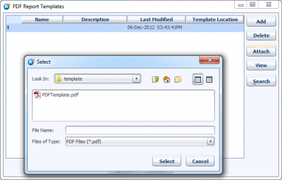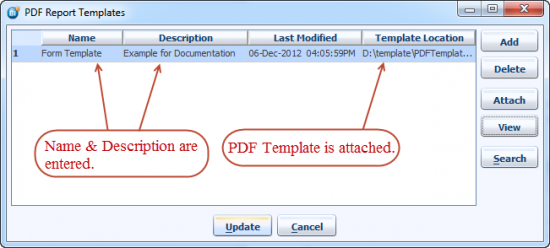 Once the template is attached, you can always view the template by bringing up this same dialog. Clicking the particular template and then clicking the View button, should open Adobe Reader or Acrobat (if you have it licensed and installed on your machine).