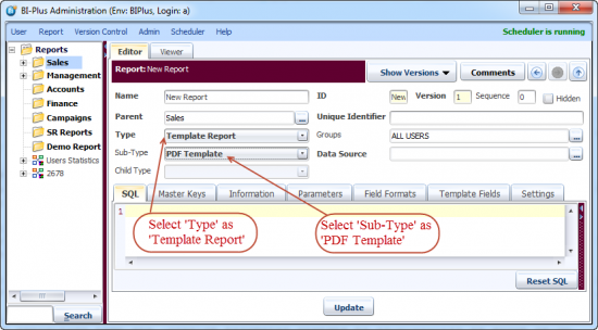 You can create a template report by selecting Type as Template Report. Select the Sub-type according to your requirement, here PDF Template report is selected.