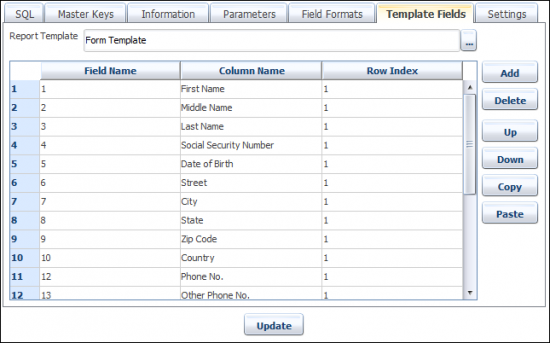 Once the template is added into the report, you need to map columns to template fields, so that each template field will be populated with the specific value from the mapped column. Mapping is done using the Field Name, Column Name and Row Index attributes.