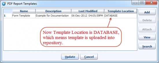 Click the update button and the template will be loaded into the BIPLUS repository as a BLOB (binary large object) datatype. Once the template is loaded into repository template location parameter changes to DATABASE as shown below.
