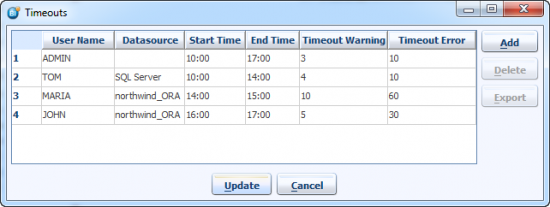 For user TOM and for SQL Server datasources of 4 seconds warning and 10 seconds timeout between the hours of 10:00 and 14:00. And so on…