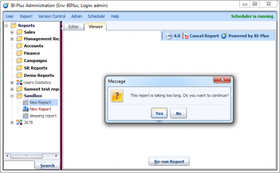 So when the Admin user runs a report and that report takes more than 3 seconds to execute then the Admin user will get a warning which says that Report is taking too long, Do you want to continue? See image below.