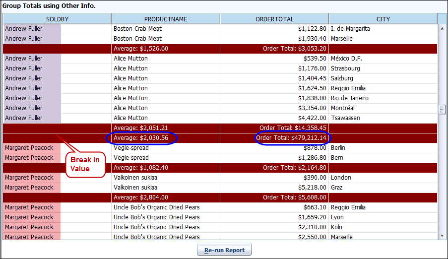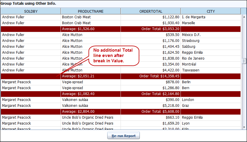 After running this report, you will see that whenever there is a break in the value of the SOLDBY column (highlighted in two different colors) an additional SUM and AVERAGE value will be also get created. This rolled up total line is based on column SOLDBY. This is the default behaviour, but we can turn this off, so that the aggregations do NOT roll up to the next level.