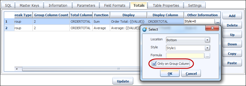 Since SALESMAN is the first column of the SQL statement, this is also used as the number of the column to provide group totals on, by selecting 1 from the drop-down list in the ‘Group Column Count’ column of the totals dialog tab.