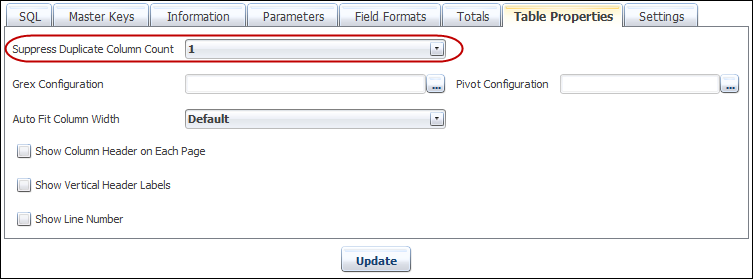 Go to the ‘Table Properties’ tab of the report, and in the field ‘Suppress Duplicate Column count’, you can choose a number, as long as the ORDER by clause contains at least as many columns, and then in this case, it is important to have the ORDER BY clause in the same sequence as the SELECT statement itself.