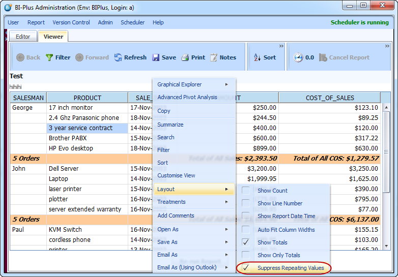 You may want to add a total for each group in the report. Using the same report as in the example above, you will now group the report into sections (groups) per salesman, and suppress the repeating column values, so that the Salesman column only appears populated when the value changes.