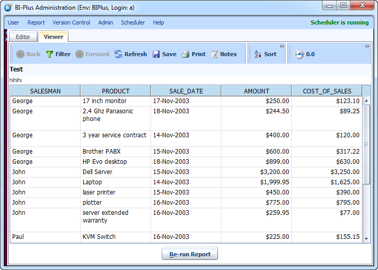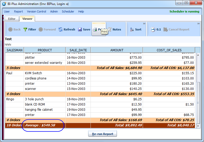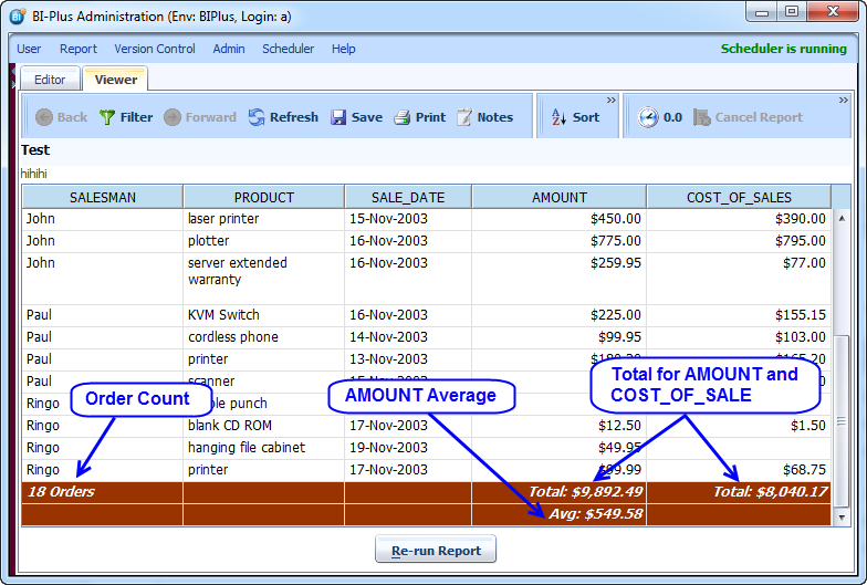 On running the report, the totals show the total sum of the AMOUNT column, the average of the AMOUNT column, and also the same totals for each break of group (SALESMAN). The report totals are still included.