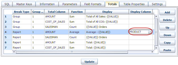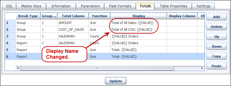 In the Totals tab, the Display column allows the customization what is displayed on the total line. Two values that are kept for each total, one is the {{NAME}} (the value of the column used for group breaks, and the values for the above report are “George”, “John”, “Paul” or “Ringo”) and the other is {{VALUE}} , which is the computed aggregate function value (Sum, Avg, Min, Max, Count).