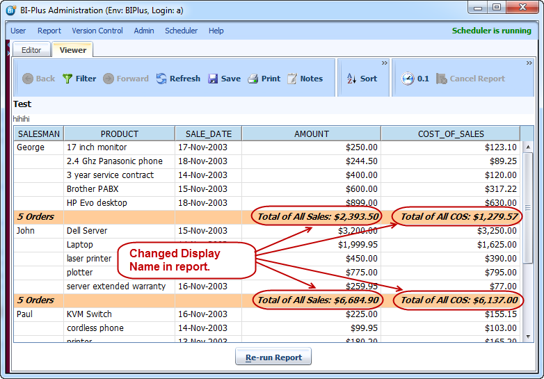 The previous report shows 2 report totals, one for the total of all Sales, the other for the Average Sale amount. Since these aggregations are both based on the AMOUNT column, they logically appear one under the other, in the order they were specified.